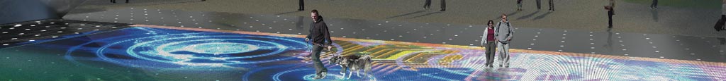 Under Currents comprises the Portal: an LED floor grid under glass in the space beneath a bridge, plus the Fields of Light: a much larger ground mounted LED grid that expands the interactive environment across the open spaces of the park.